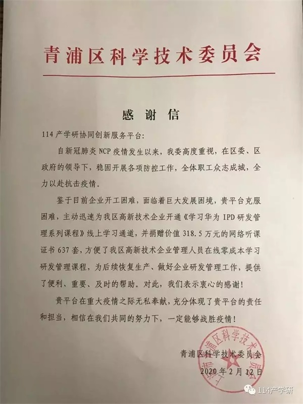 2020年新冠肺炎疫情爆发后,受疫情影响,各地高新技术企业复工受到严重影响,科技管理部门心急如焚,纷纷紧急寻求各种能够帮助到科技企业提升科技创新能力、能够有利于引领或主导产业布局的具体方案。史志东组织114产学研协同创新服务平台的全体员工,及时将“研铁堂”网络创新培训课程平台中的《IPD研发管理》系列培训课程向国内科技企业捐赠。该课程是深入研究IBM和华为成功的研发管理系统后,开发出来针对广大科技企业方便导入使用的系统化研发管理课程,能有效提升研发管理能力,增强核心竞争力,减轻疫情对企业的影响。